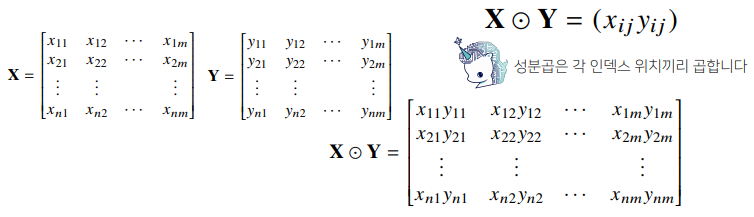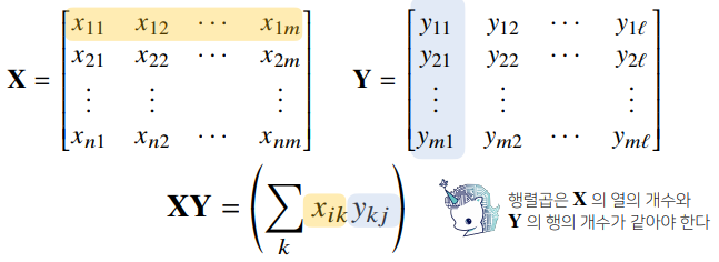 행렬곱셈(matrixmultiplication)은 i번째 행벡터와 j번째 열벡터사이의 내적을성분으로 가지는 행렬을 계산합니다.