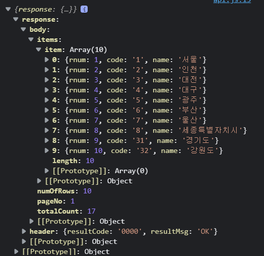 이 지역코드들이 담긴 데이터들에서 지역 이름들을 호출 해볼 것이다.