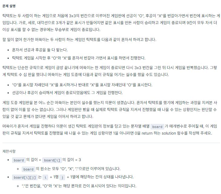 - 아무리 많은 경우를 고려해봐도 통과하지 못하는 테스트 케이스가 있어서 마지막으로 틱택토에서 승자가 나오는 경우를 구현한 함수를 수정하였는데 통과했다. 불필요하게 for문을 쓰다 보니 원하는 결과가 나오지 않았다. 단순하게 구현할 수 있다면 길어지더라도 단순하게 코드를 작성해야겠다.