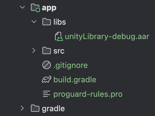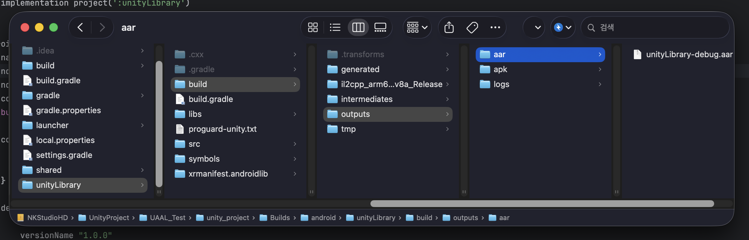 빌드가 완료되면 unityLibrary폴더 경로에 build/outputs/aar에서 unityLibrary-xxx.aar 파일이 생성된 것을 볼 수 있습니다.