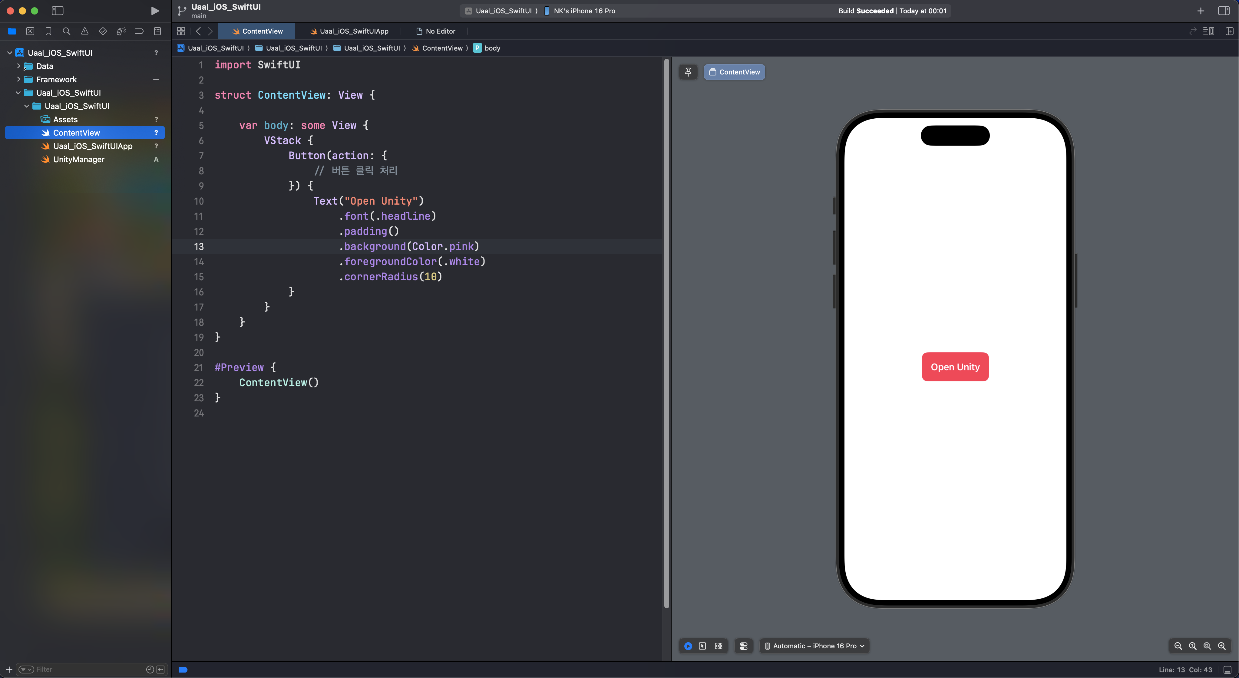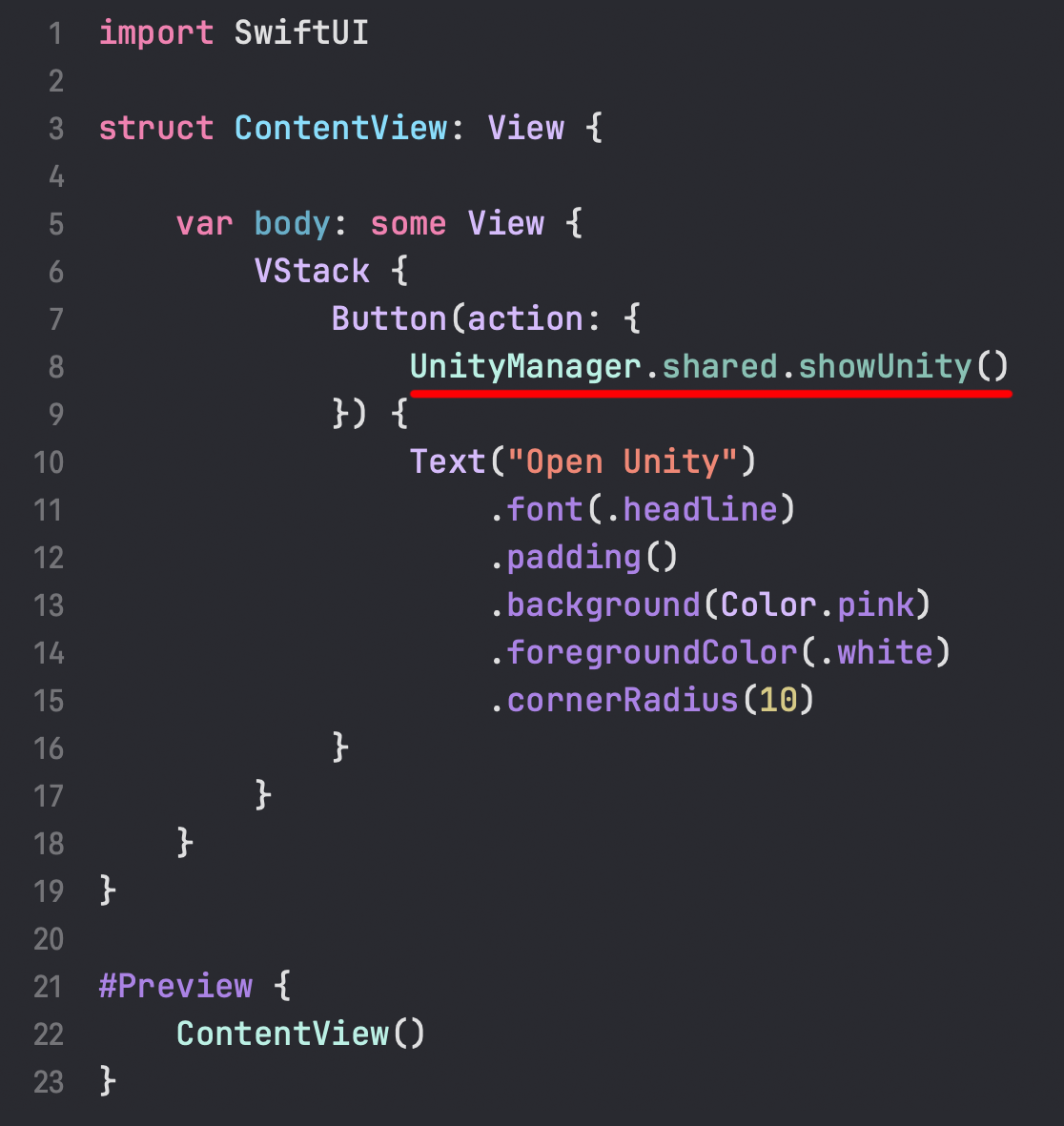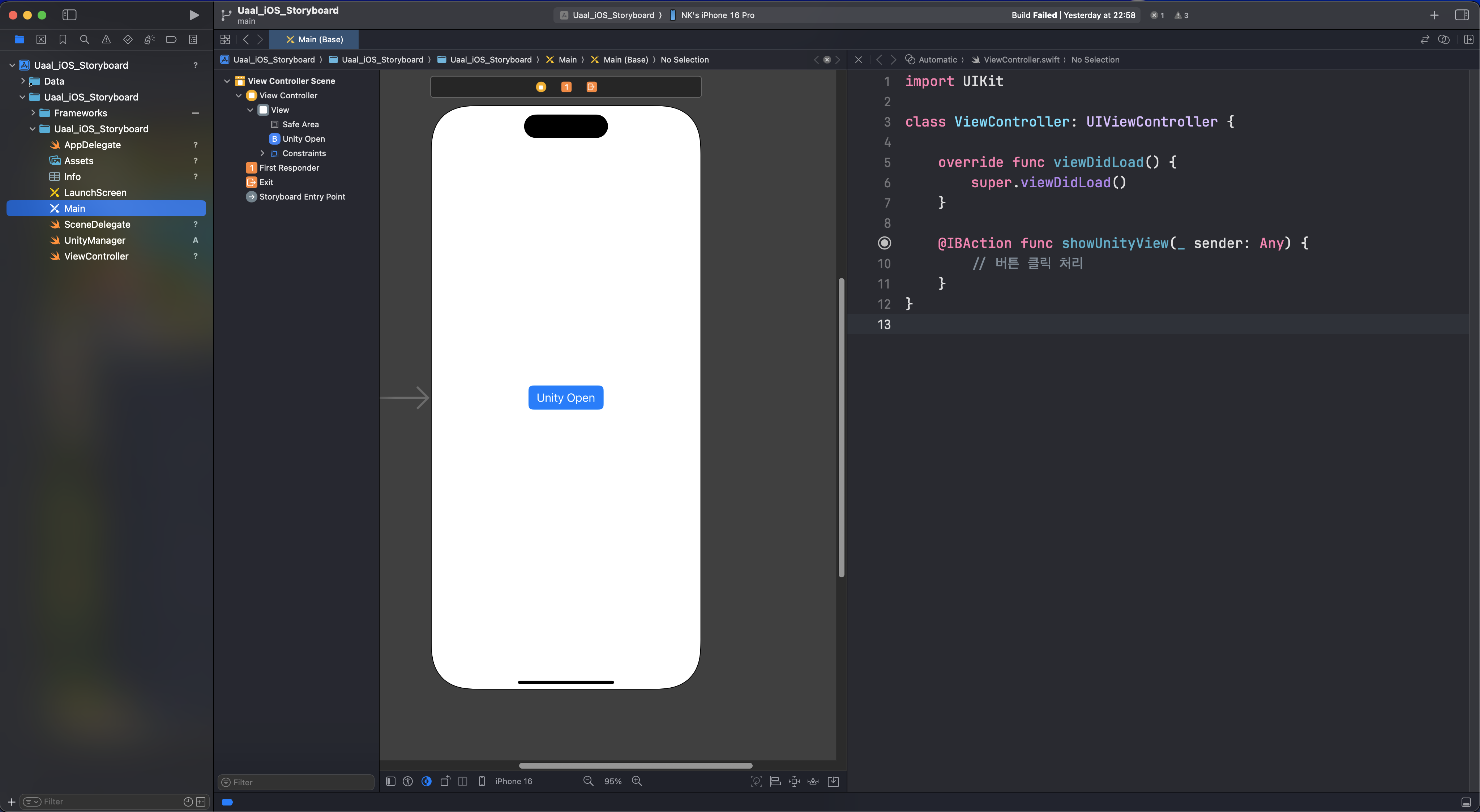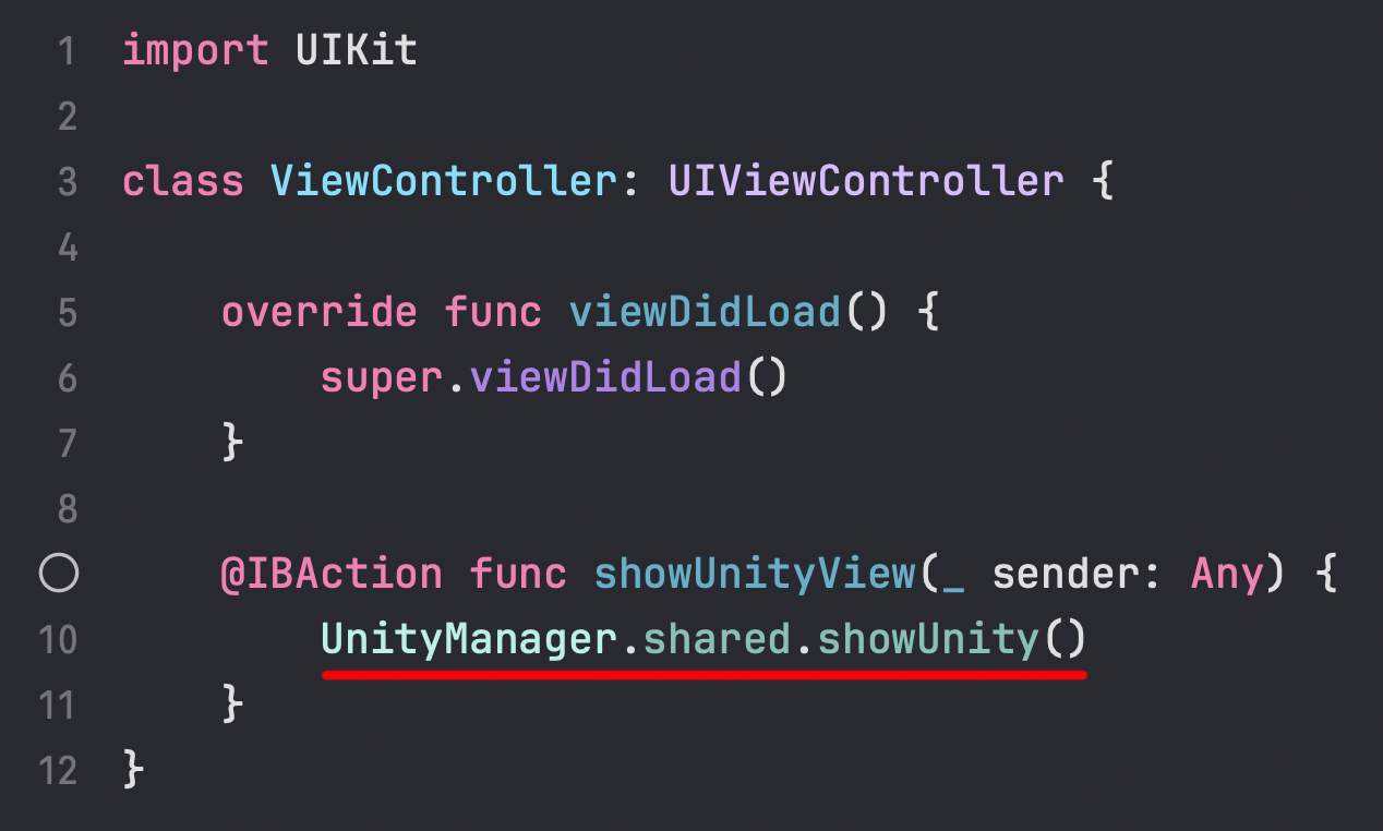이 버튼을 터치했을 때 우리가 만든 Unity 콘텐츠가 실행되도록, 버튼의 동작(action) 부분에 UnityManager.shared.showUnity() 코드를 추가해 주기만 하면 됩니다.