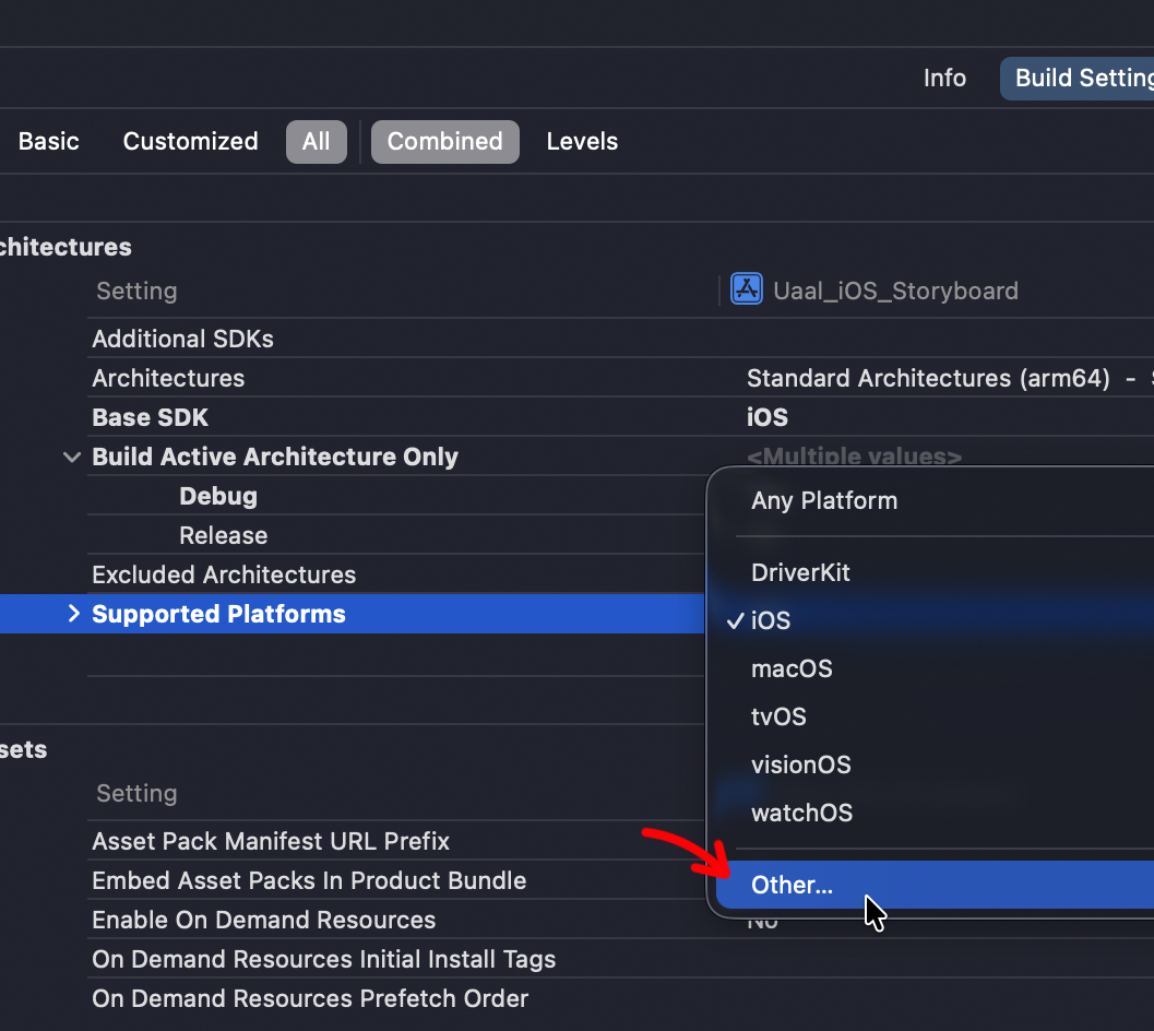 Xcode 프로젝트에서 PROJECT -> Build Settings로 이동하여 Supported Platforms를 변경해봅니다. 드롭다운을 클릭하여 Other...을 클릭합니다.