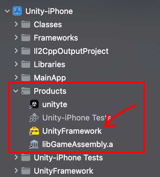 빌드가 완료되면 Products폴더에서 UnityFramework가 활성화 되는 모습을 볼 수 있습니다.
