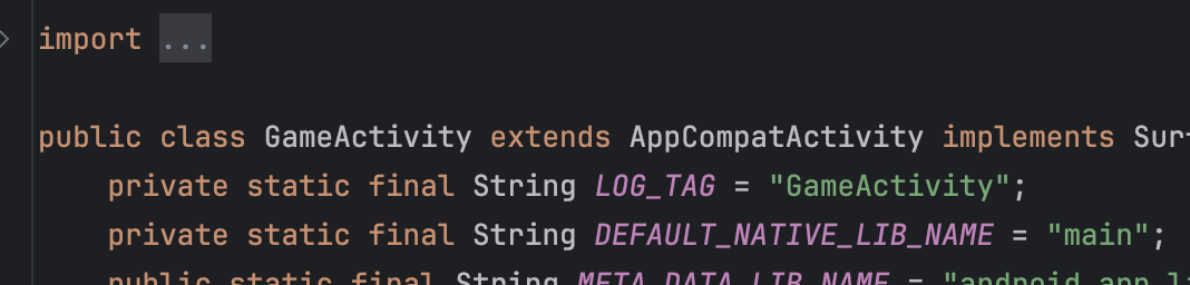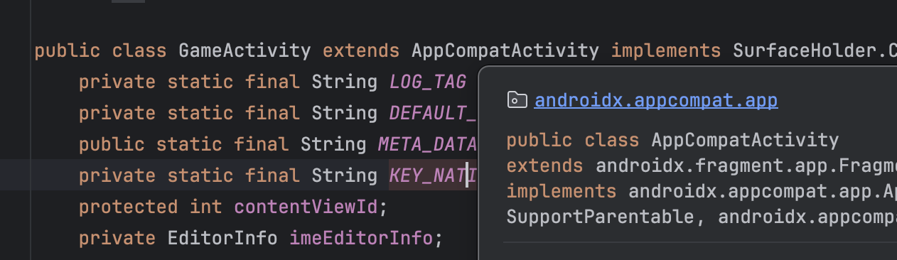 정상적으로 임포트되었다면 다음과 같이 com.google.androidgamesdk.GameActivity에 대해서 반응하는 모습을 볼 수 있습니다.