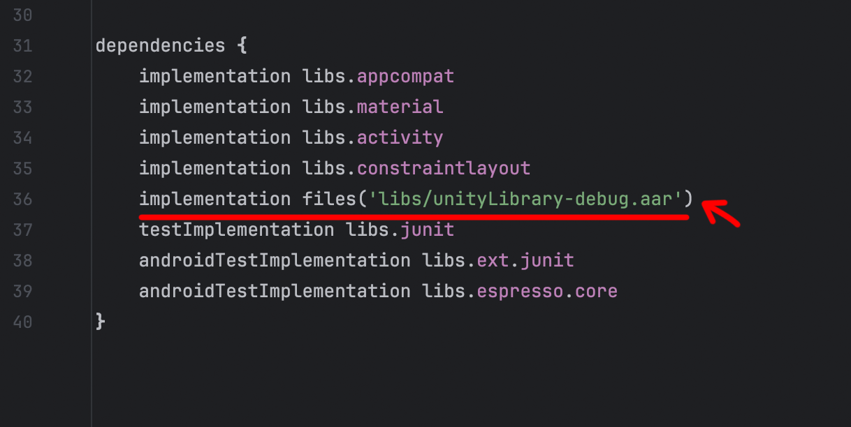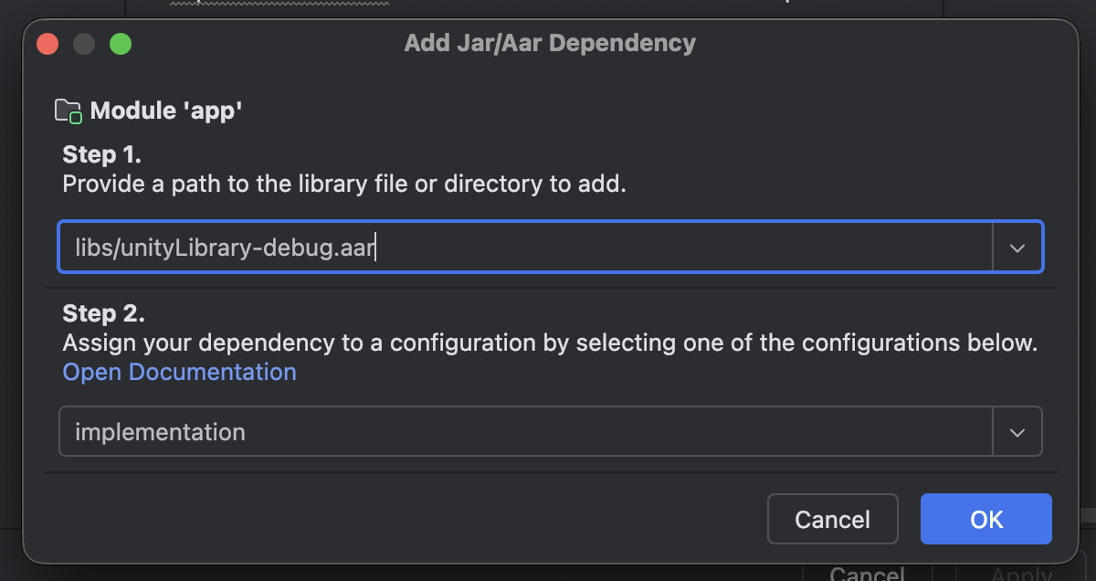 unityLibrary-debug.aar파일이 추가된 것을 확인했다면 OK를 눌러서 완료합니다.