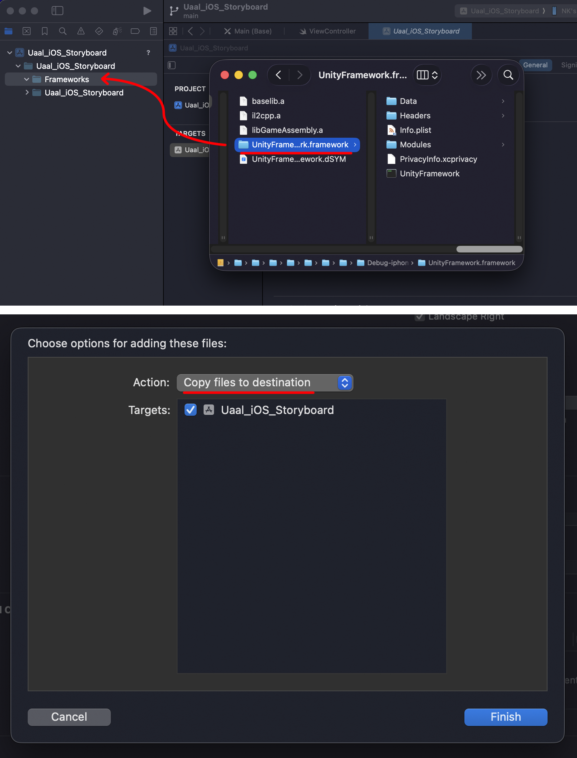 UnityFramework.framework를 네이티브 프로젝트에 드래그 & 드롭으로 추가합니다.