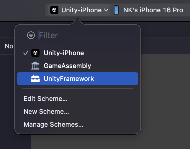 상단에 Scheme을 Unity-iPhone을 UnityFramework로 변경 후 재생 버튼을 클릭하여 빌드를 진행해줍니다.