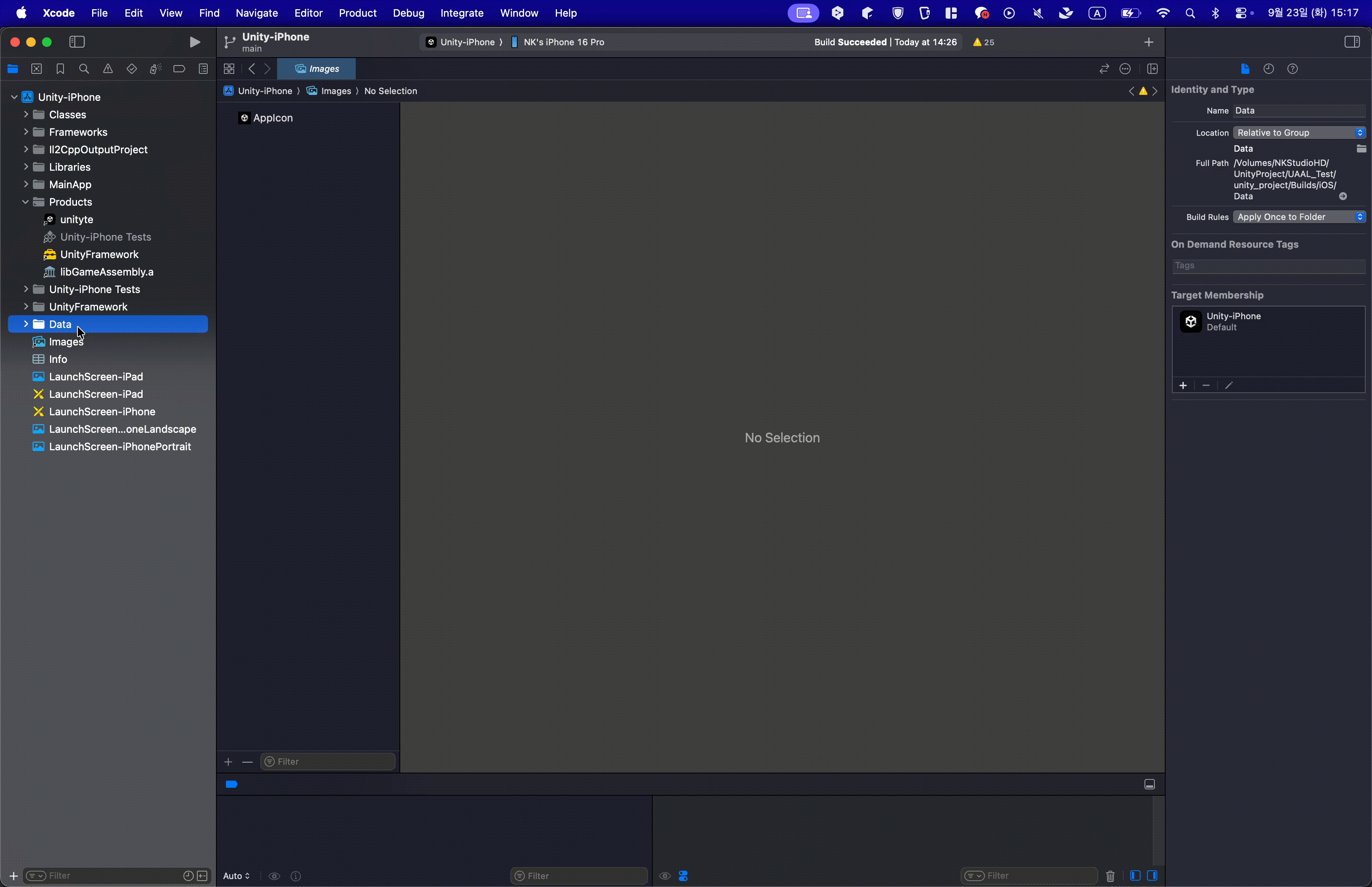 Data 폴더를 클릭하고 Show the file Inspector/Target Membership에서 Unity- iPhone -> UnityFramework로 변경합니다.