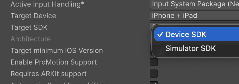 Target SDK를 디바이스만 지원하거나, 시뮬레이터만 지원하도록 둘 중 하나를 선택해야합니다.