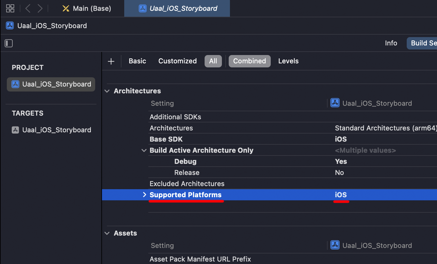 최종적으로 Supported Platforms가 iphoneos로 단독 타겟팅 되어있는지 확인합니다.