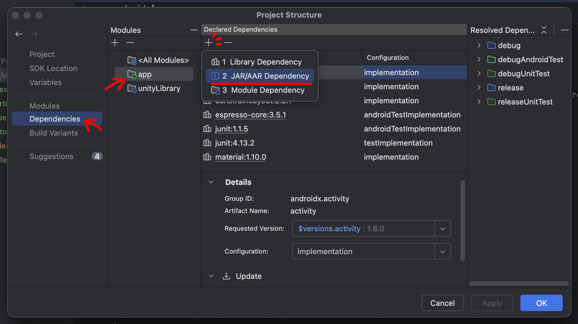 Dependencies에서 Modules에 app을 선택하고 JAR/AAR Dependency를 선택합니다.