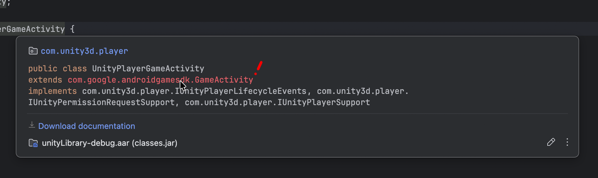 UnityPlayerGameActivity는 com.google.androidgamesdk.GameActivity를 상속받습니다.
