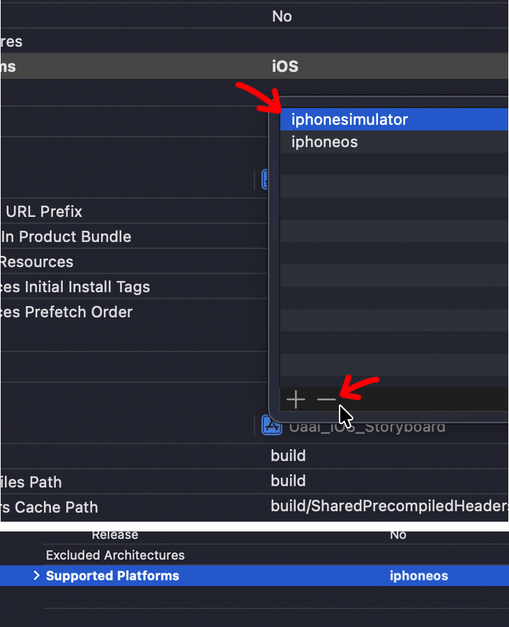 iphonesimulator를 선택하고 - 표시를 클릭하여 제거해줍니다.