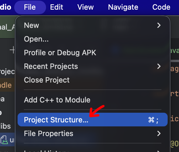 안드로이드 스튜디오 상단에 File/Project Structure...를 선택합니다.