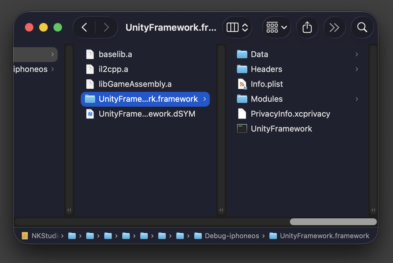 이 과정을 통해 UnityFramework를 빌드하면 UnityFramework.framework 안에 Data 폴더가 안에 포함됩니다. (기존은 빌드하면 Unity-iPhone에 Data폴더가 포함 되는 구조.)
