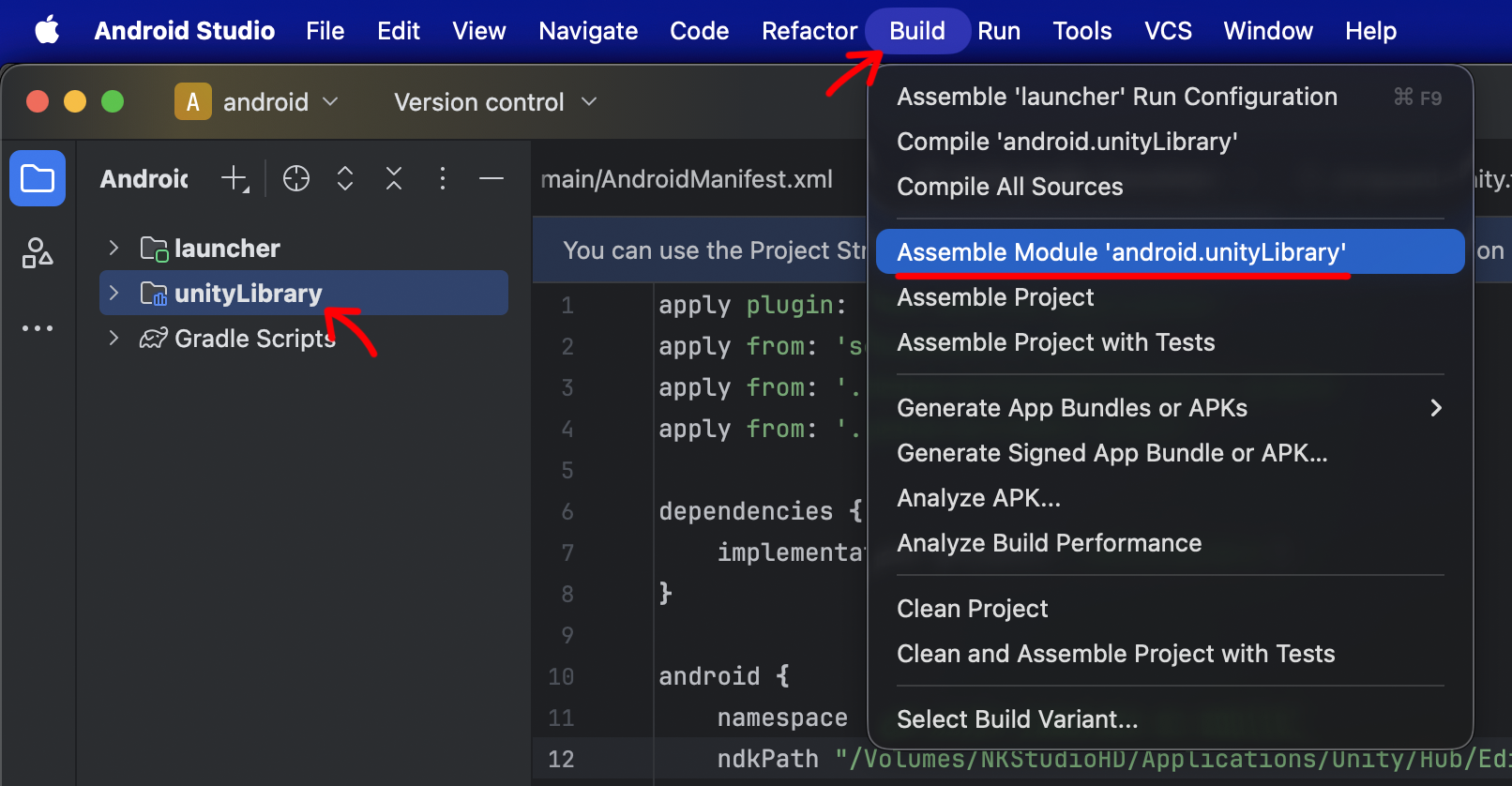 unityLibrary를 먼저 선택한 상태에서 상단에 Build/Assemble Module 'Android.unityLibrary'를 선택합니다.
