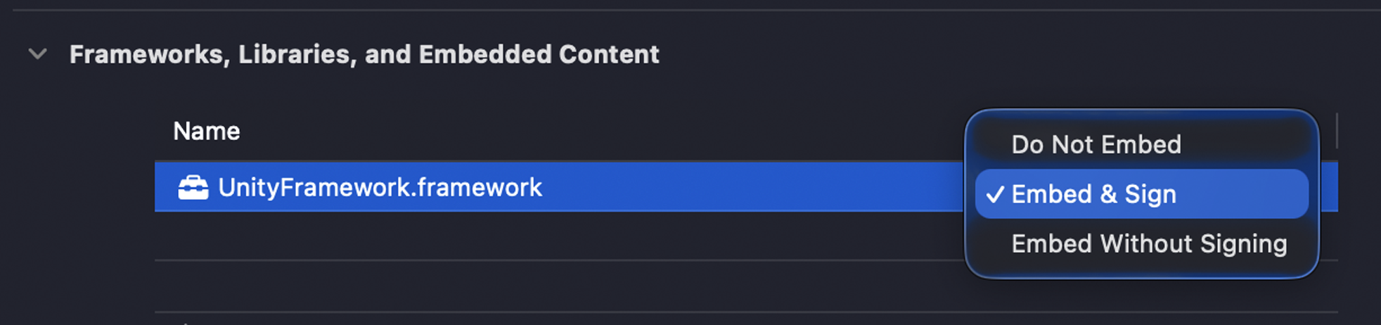 'Frameworks, Libraries, and Embedded Content' 섹션에서 UnityFramework.framework의 Embed 옵션을 설정을 Embed & Sign으로 지정합니다.