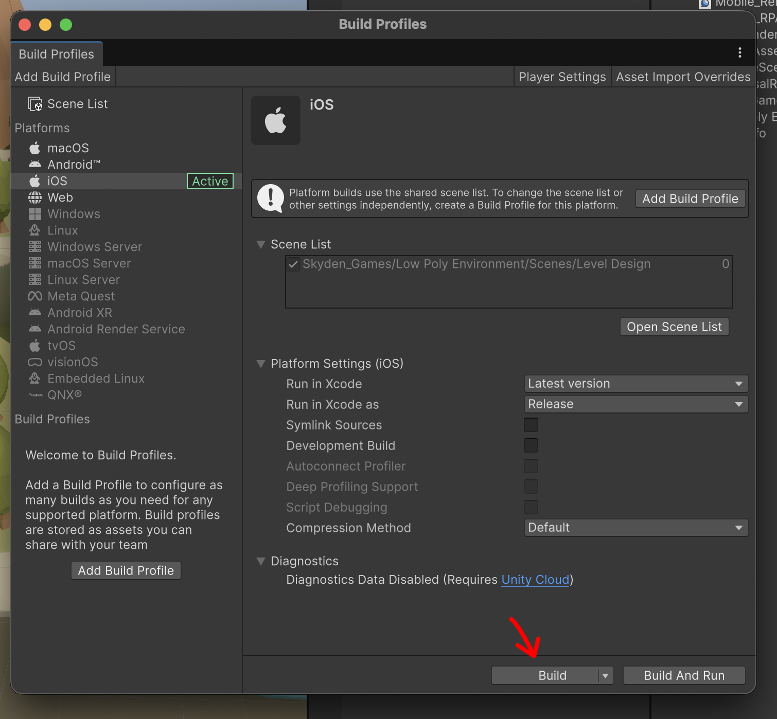 Build Profiles에서 iOS로 빌드를 진행합니다.