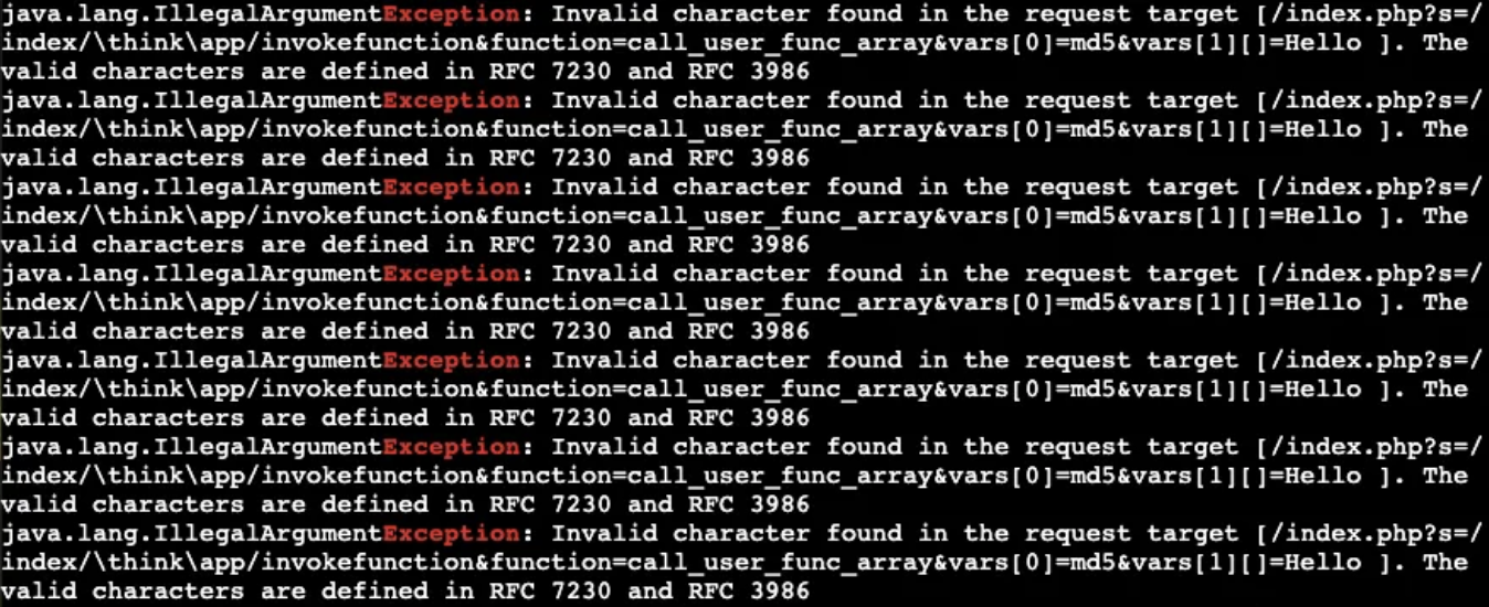 java.lang.IllegalArgumentException: Invalid character found in the request target [/index.php?s=/index/think\app/invokefunction&function=call_user_func_array&vars[0]=md5&vars[1][]=Hello].