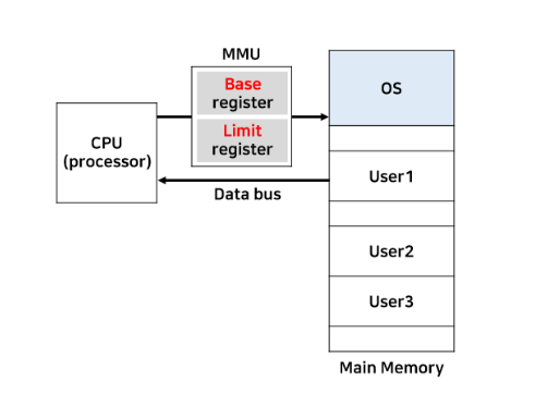 - address bus 중간에 설치된 MMU 하드웨어 칩의 두 개의 레지스트러르 통해 해당 프로그램의 주소 범위를 저장한다.