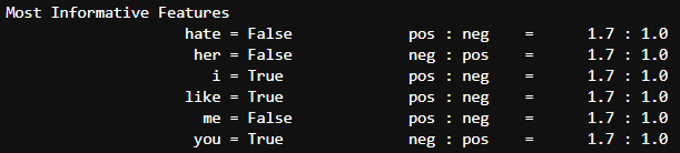 -> like가 있을 때, Positive할 확률이 1.7:1.0이다… 뭐 이런식으로 분류가 되었음