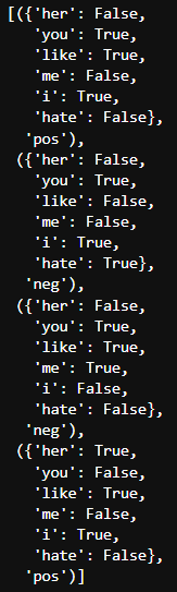 t = [({word : (word in word_tokenize(x[0])) for word in all_words}, x[1]) for x in train]