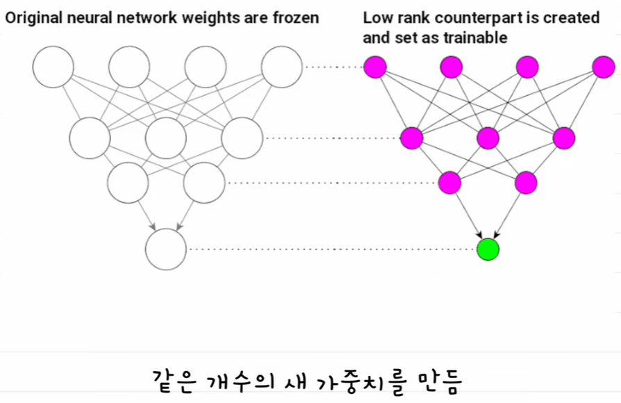 LoRA는 기존 모델의 가중치를 고정하면서, 저차원 행렬로 분해된 새로운 가중치를 추가로 학습하는 방식