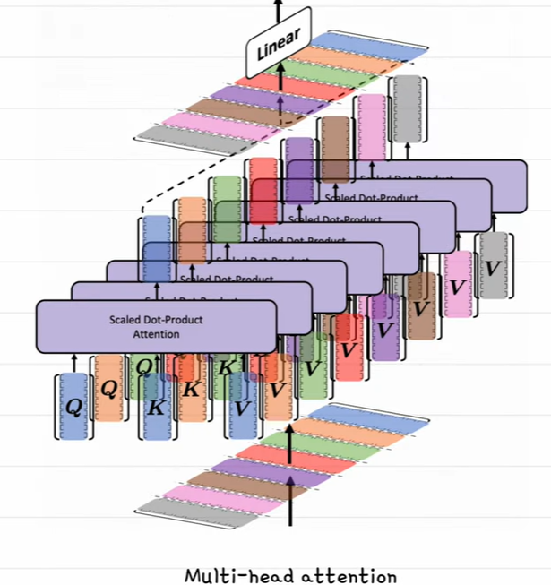 단어와 단어 사이의 관계를 보는 여러가지 컨셉을 학습하기 위해서, 문장을 여러개의 헤드라는 벡터로 나누구 각각의 어텐션을 구한 뒤 합친다.