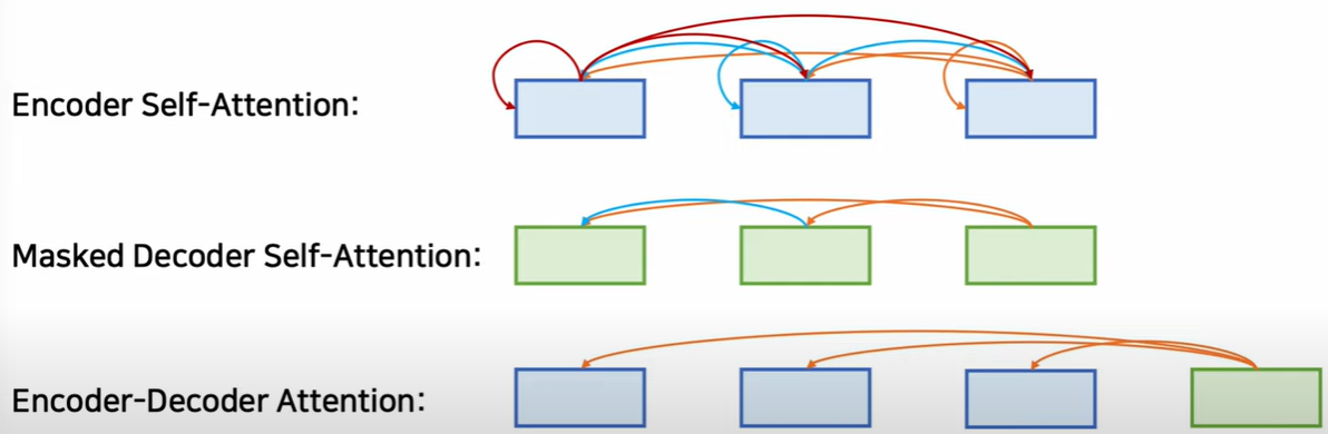 3) 인코더에서 나온 context 벡터와 디코더에서 입력과의 관계를 구하는 것을 인코더 디코더 어텐션 이라고 한다.