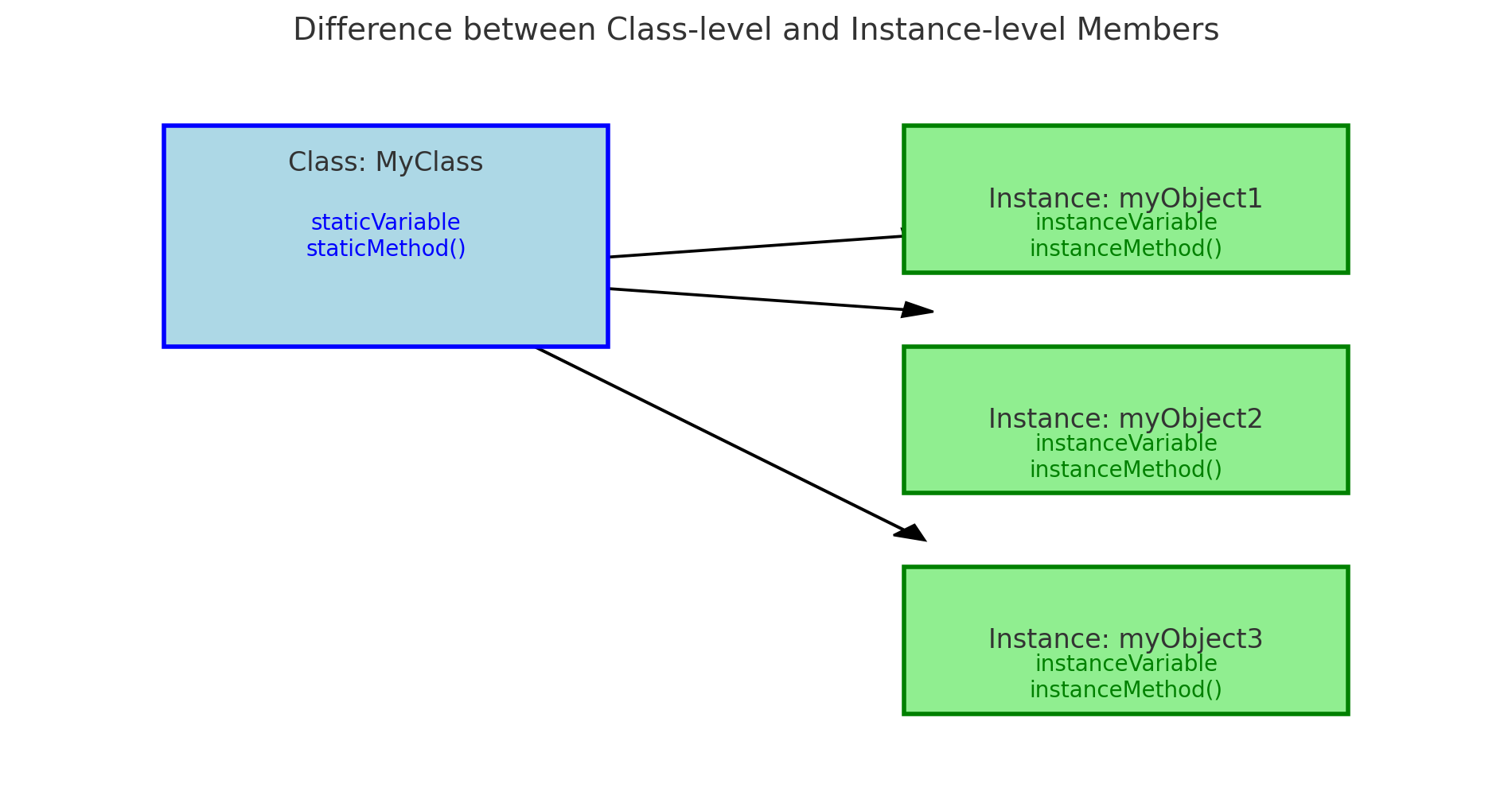 staticVariable 및 staticMethod()는 클래스 레벨의 멤버로, 클래스 자체에 속하며 모든 인스턴스 간에 공유된다.