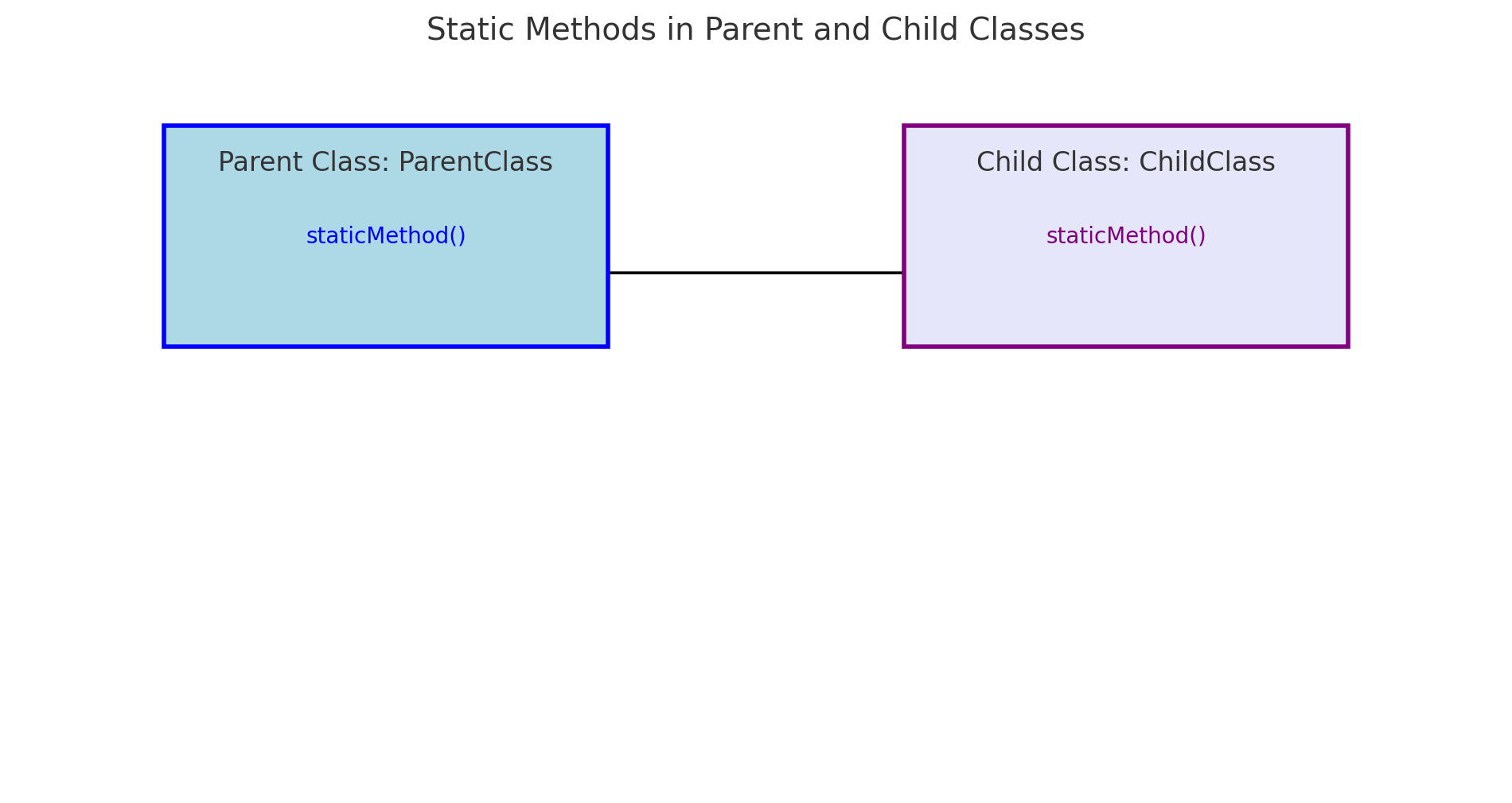 위 그림과 같이 부모 클래스와 자식클래스에서의 staticMethod()는 독립적으로 각각의 클래스 자체에 속한다. 따라서 부모클래스를 상속받았다 할지라도 그것은 자식클래스에서 부모클래스의 staticMethod()에 접근이 가능하게 된 것일 뿐, 부모클래스의 staticMethod()는 여전히 부모클래스에만 속하며 자식클래스에는 속하지 않는다.