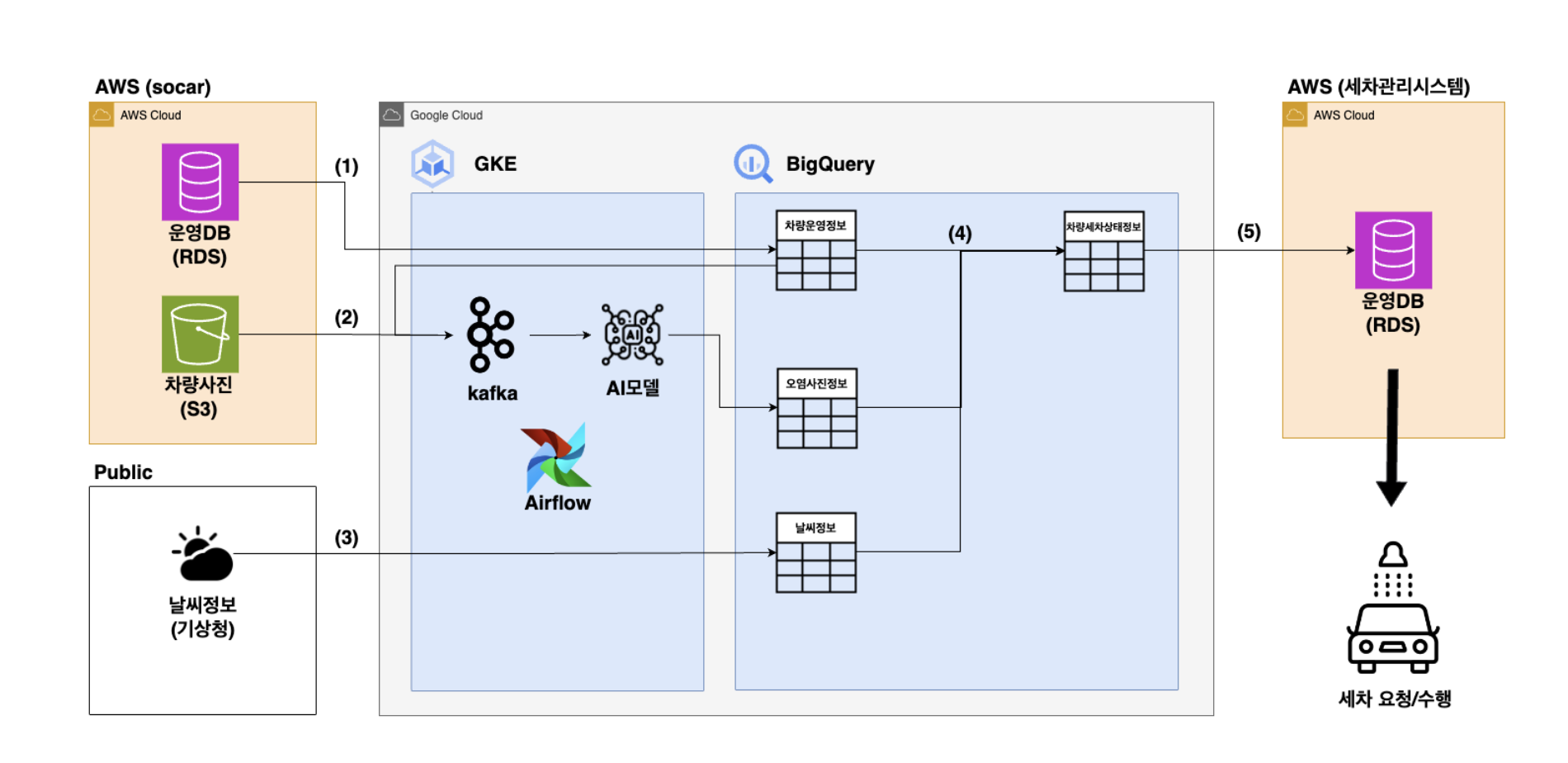 - 차량운영정보, 차량사진 오염정보, 날씨정보 활용하여 세차가 필요한지 판단