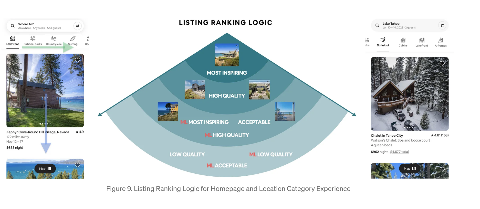예를 들어, lake Tahoe 위치를 검색할 경우, 관련된 카테고리인 skiing, cabins, lakefront, lake house가 노출되며, 특히 겨울철에는 skiing이 가장 먼저 노출되어야 함