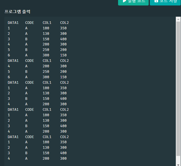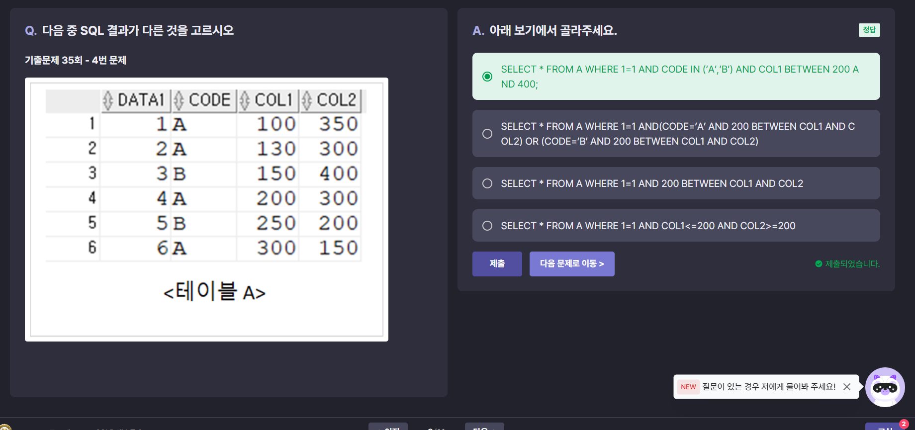 SELECT * FROM A WHERE 1=1 AND CODE IN ('A','B') AND COL1 BETWEEN 200 AND 400;