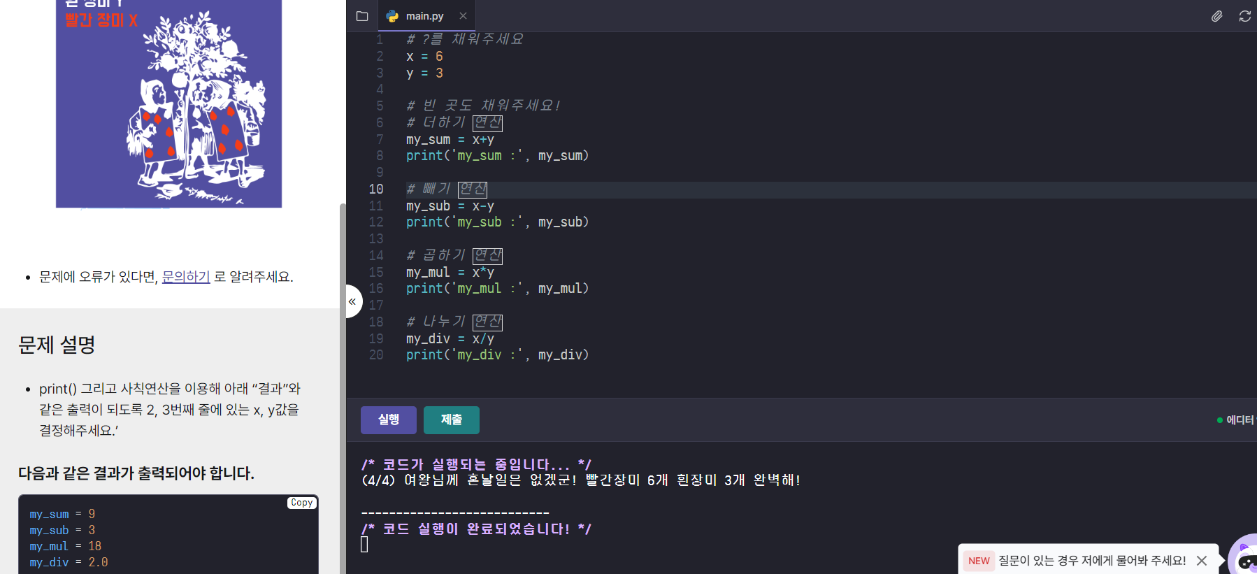 Q. print() 그리고 사칙연산을 이용하여 아래 '결과'와 같은 출력이 되도록 2,3번째 줄에 있는 x,y값을 결정해주세요.