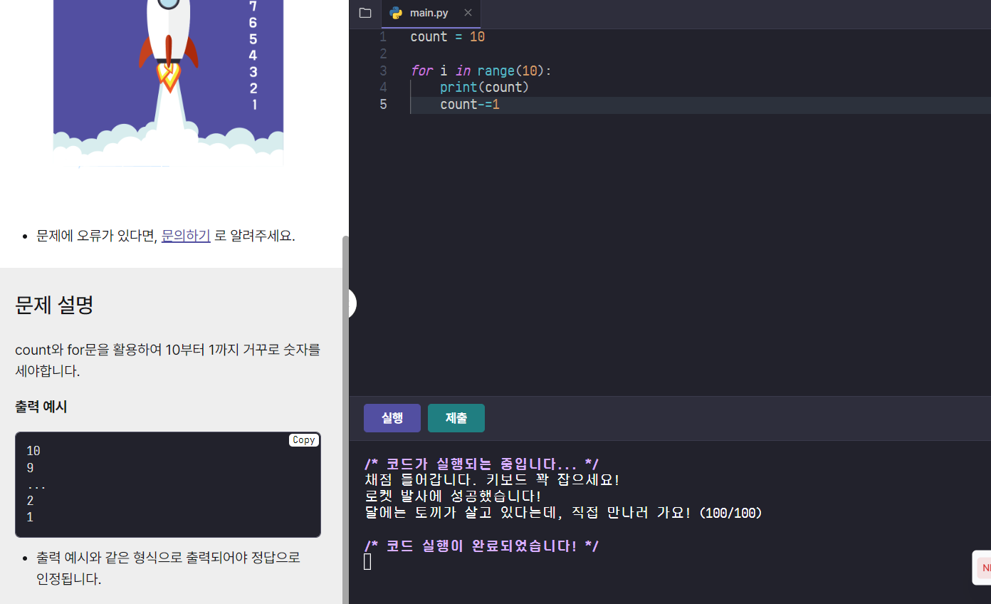 Q. count와 for문을 활용하여 10부터 1까지 거꾸로 숫자를 세시오.