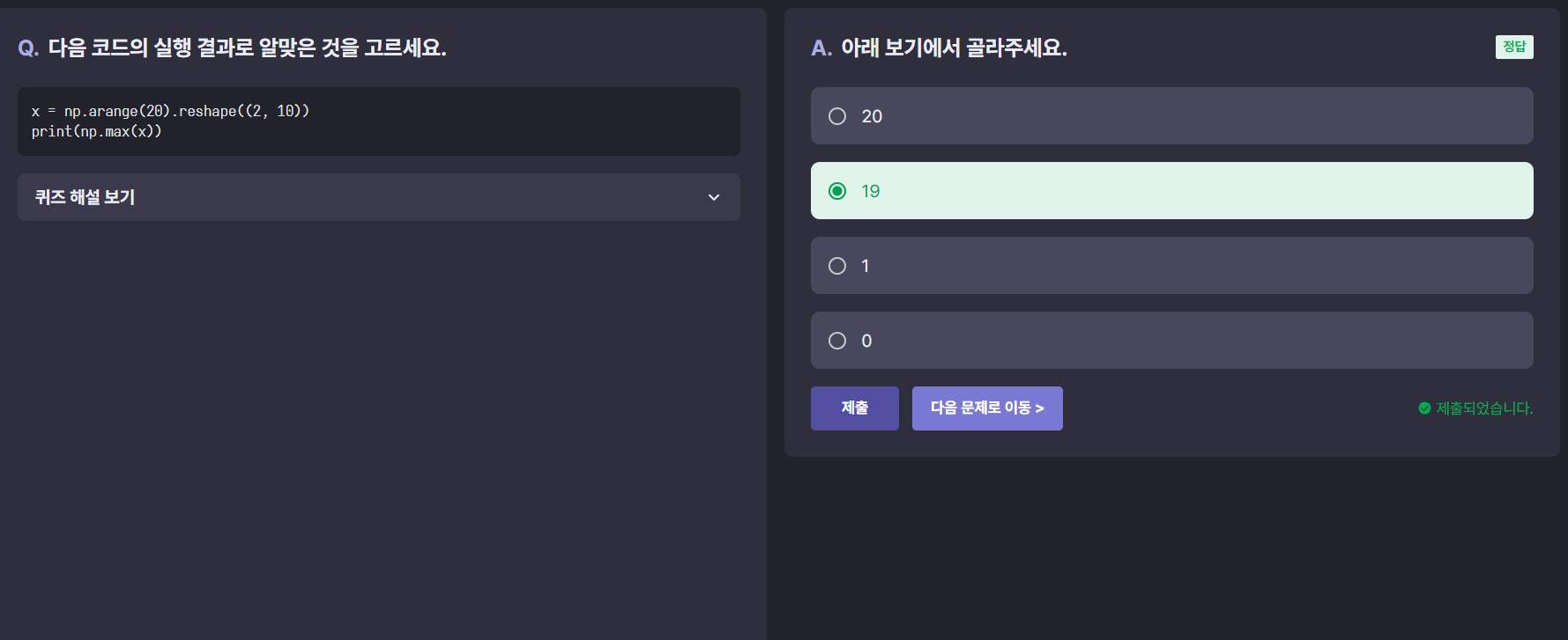 해설 => np.arange(20) 은 0~ 19까지의 숫자이고, reshape((2,10)) 을 통해 행2 열10인 형태로 변환되는데, 집계함수 max( ) 를 이용하여 가장 큰 숫자를 반환해야 하므로 19 를 출력한다.