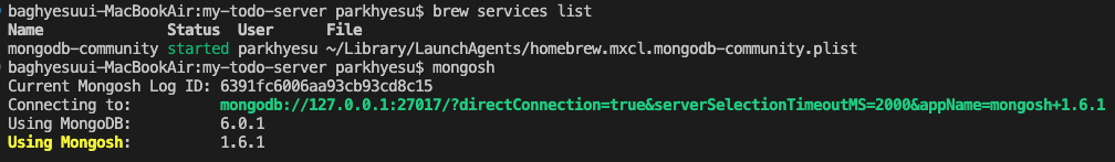brew services start mongodb-community๋ฅผ ํตํด์ ํฐ๋ฏธ๋๋ก ์ ์ ํ,