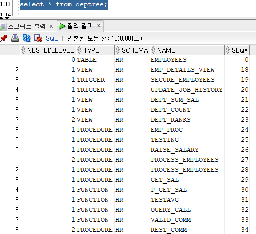 해당 프로시저를 실행시키면 deptree_fill view가 생성되고 해당 view를 통해 트리구조로 종속관계를 확인할 수 있다.
