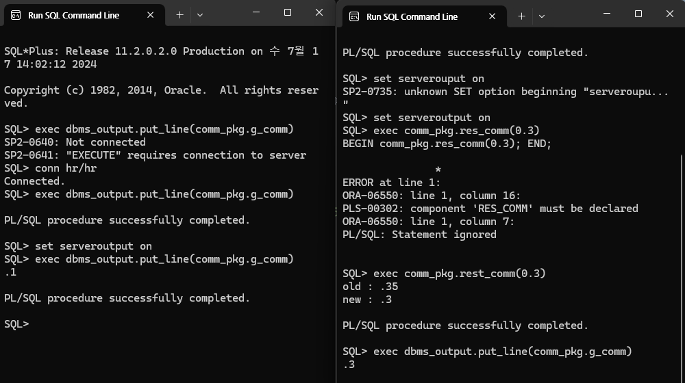 테스트를 hr계정에서 하기 때문에 hr계정에 conn한 후 아래 코드를 실행한다.