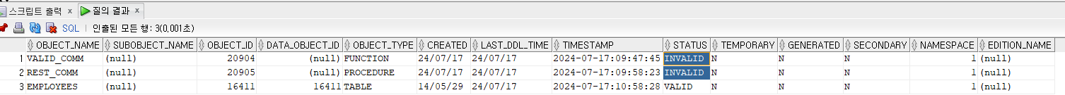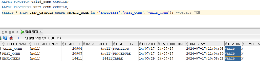 SELECT * FROM USER_OBJECTS WHERE OBJECT_NAME in ('EMPLOYEES','REST_COMM','VALID_COMM'); --OBJECT 정보