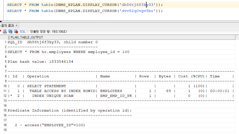 위 두 실행계획을 비교해보면 실행계획 sql_id와 검색하는 id값만 다를 뿐, 내부적인 실행계획은 완전히 같은 것을 알 수 있다.
