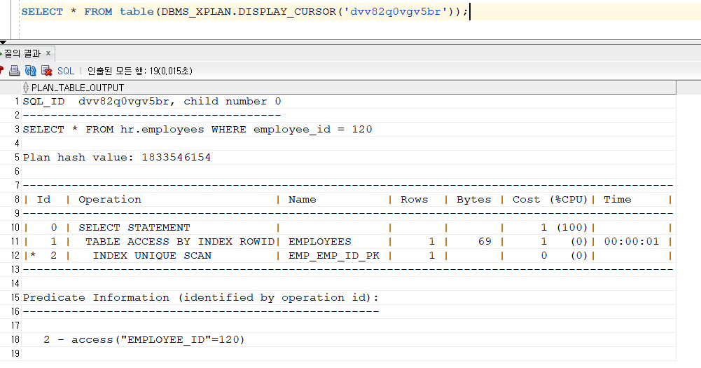 각각의 문장에 따라 서로다른 실행계획이 실행되며 sql_id의 값을 통해 실제 실행계획을 자세하게 조회할 수 있다.