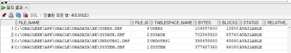 결과를 봤을 때 TABLESPACE_NAME칼럼이 tablespace에 대한 기술ㅇ며
