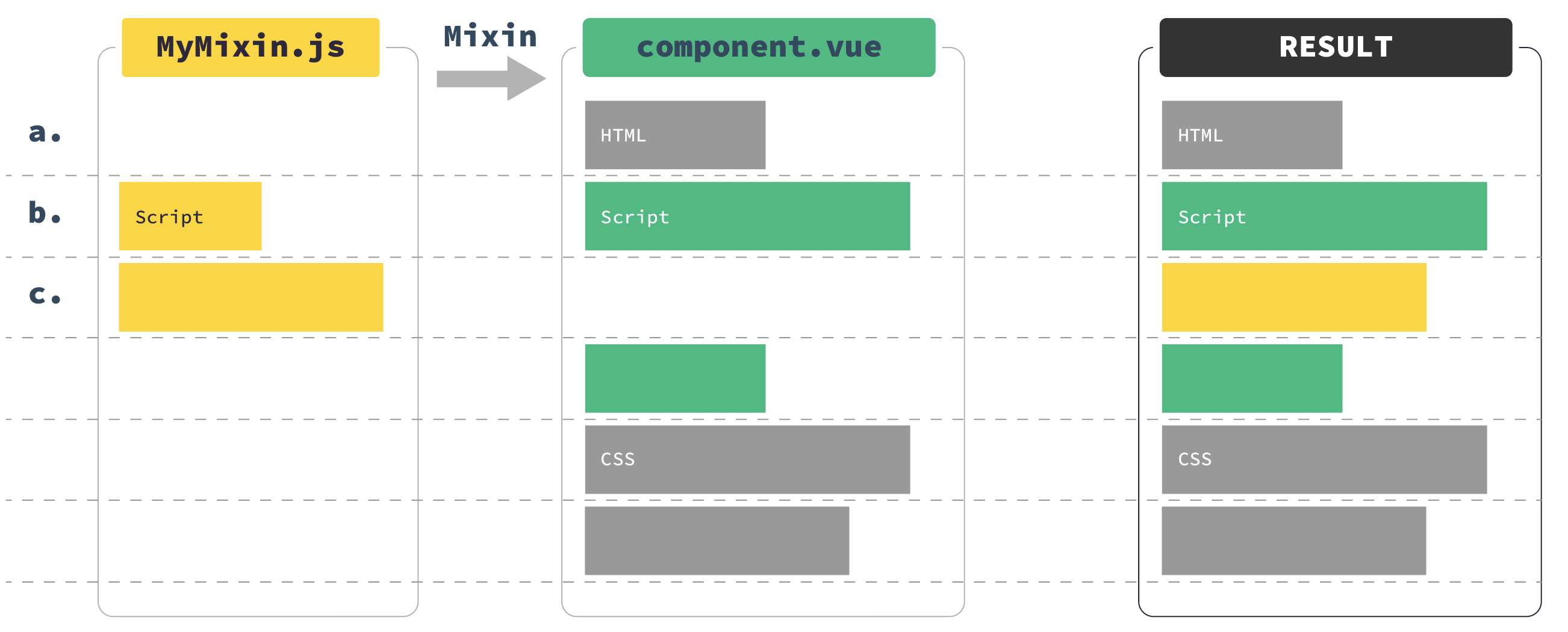 믹스인은 이름이 나타내고 있는 것 처럼 컴포넌트에 무언가를 섞어 원하는 것을 구현하는 기능입니다. 믹스인을 구현하고 동작시키는 과정을 순서대로 쓰면 아래와 같이 정리할 수 있습니다.