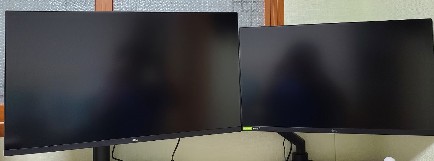 기존에 사용하던 모니터는 LG 27gp750(오른쪽)으로 눈으로 보기에도 크기가 다르죠.. 여기에는 가장큰 불편함이 존재하더라고요.