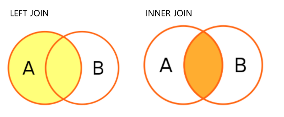 필요한 데이터들이 각기 다른 테이블에 있을 때, 테이블을 합칠 수 있다. left join과 inner join의 차이점은 사진으로 확인할 수 있다.