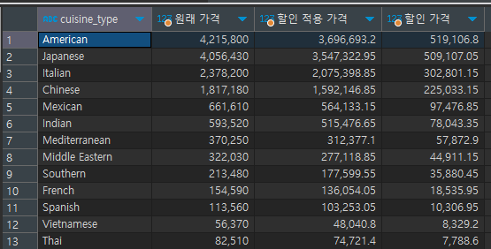 # 이후 본 쿼리에서 원래 가격, 할인 적용가격, 할인 가격을 가져온다.