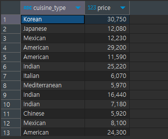 food_orders에 해당하는 칼럼이 너무 많아서 한눈에 보기 힘들 때 내가 원하는 값만을 가져오고 싶다면 select에 칼럼을 지정하면 됩니다. 예를 들어 food_orders에서 cuisine_type과 price만 가져와보겠습니다.