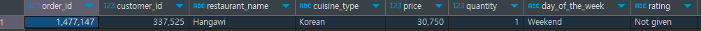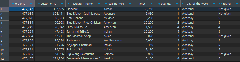 이렇게 하면 다음과 같이 food_orders에 모든 칼럼을 볼 수 있습니다.
